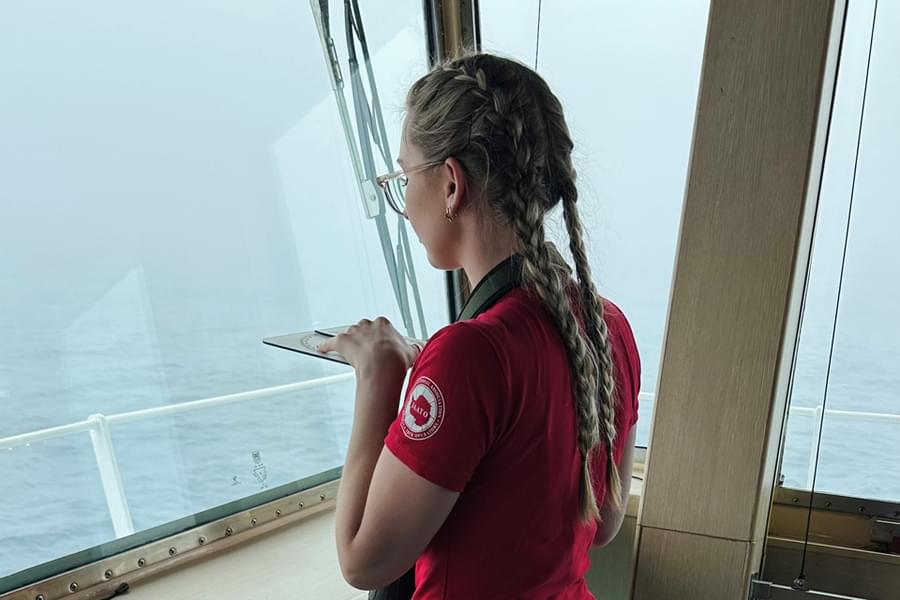 When I was not collecting data from the Frams’s bridge, I was out on deck watch... in the (very) cold! I had some truly breathtaking moments while on board and was lucky enough to expand my whale and dolphin repertoire, including spotting some ‘firsts’, which I was incredibly excited about. During my wildlife watches out on the bow, I managed to spot sei whales, fin whales, humpback whales, hourglass dolphins, Peale’s dolphins and Commerson’s dolphins, to name a few. It was especially heart-warming to share these encounters with avid wildlife watchers on board, who took such a keen interest in the marine wildlife around them and often joined me out on deck.