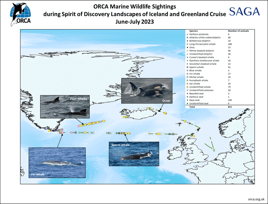 Hello, Wildlife Officer Chrissy here to share just a little of the incredible journey myself and the team of volunteer Marine Mammal Surveyors had whilst exploring the Arctic in search of whales, dolphins and porpoises. On the 28th of June, I joined fellow ORCA Marine Mammal Surveyors Becca, Bill and Stuart, on the Saga Spirit of Discovery travelling from Tilbury up to Scotland and from there to Iceland and Greenland. We were all thrilled to have the opportunity to survey this route, as one of the trained teams who join specially selected Saga cruises to collect data as well as inspiring and informing guests about the incredible marine wildlife which can be seen en route.