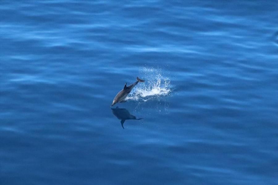 Whilst harbour porpoises are the smallest cetacean in UK and European waters, we also had many sightings at the other end of the spectrum. Fin whales, which are the second largest species of whale and can grow to a length of 27 metres, were the whale species we encountered most often. The number of fin whales in the Bay of Biscay increases during the summer months when they come into the area to feed, peaking in August. A key identification feature of fin whales is their asymmetrical jaw colouration – their lower right jaw is white, whereas their lower left jaw is grey. The other feature to look for is their swept-back, hooked dorsal fin, which can be 60cm in height!