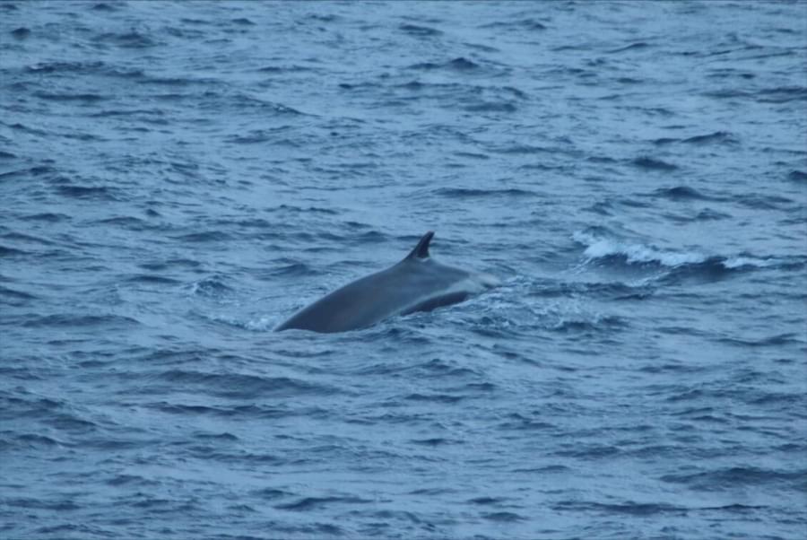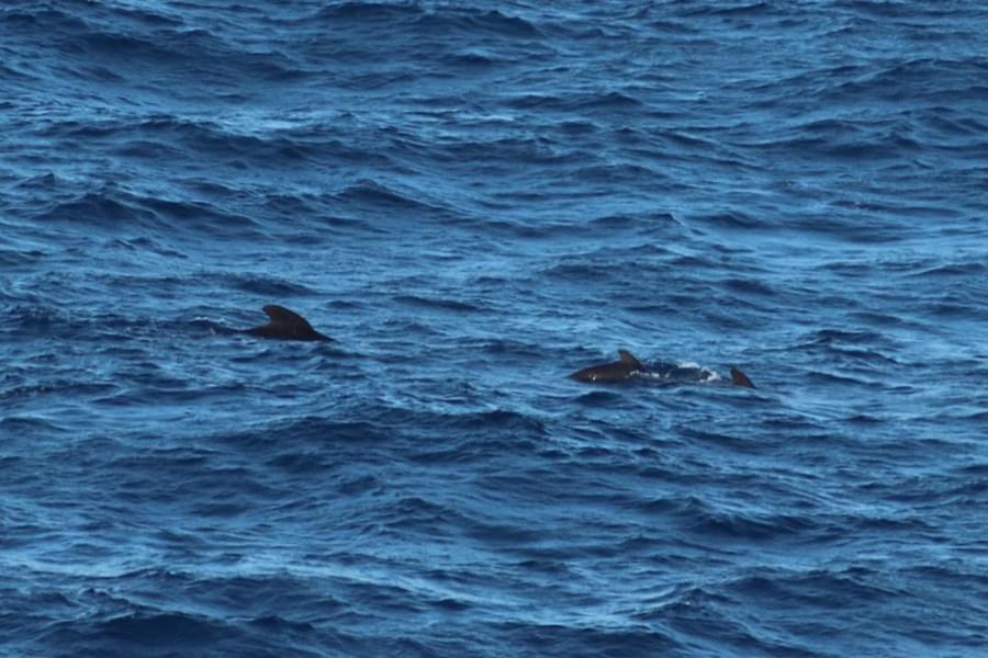 One of my favourite species, and one we were lucky enough to encounter several times, is the pilot whale. Pilot whales are actually members of the dolphin family, and they get their name from the old theory that they followed a leader or ‘pilot’. This squid-eating species frequently feeds at night, and so they are often seen resting during the day, which makes for great viewing! The key identification feature of pilot whales is their dorsal fin – it is positioned towards their head, rather than being central, and has a distinctive hooked shape. The dorsal fins are particularly wide-based and hooked in older males.