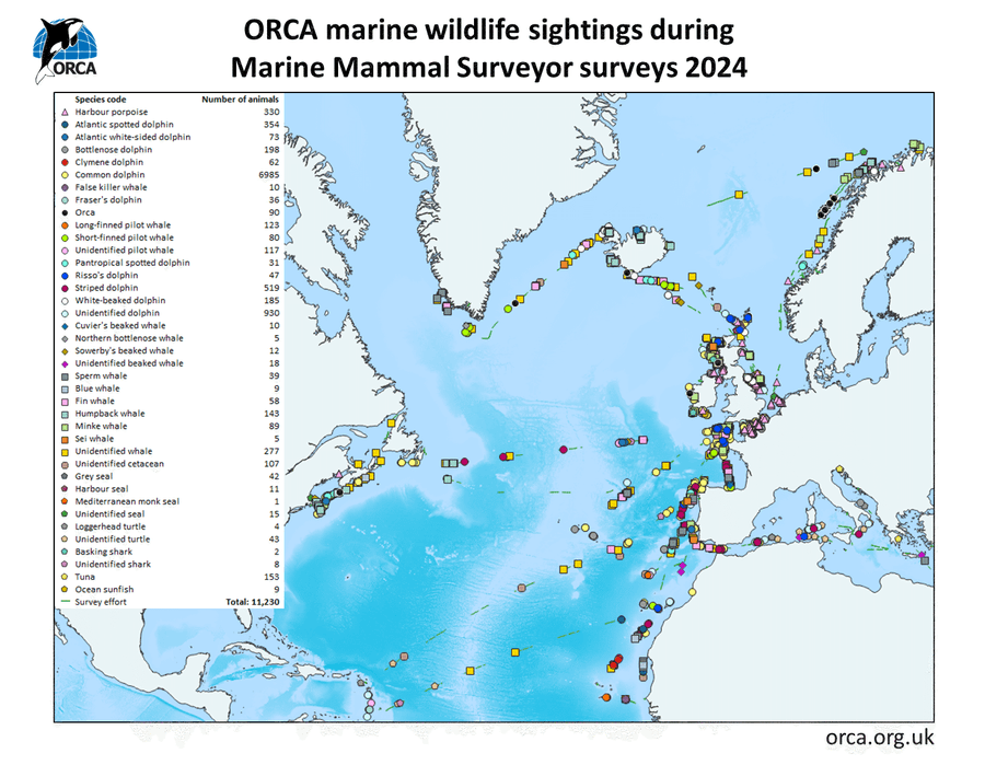 Here we are again at the end of another year. During 2024, ORCA Marine Mammal Surveyors conducted an astonishing 54,365 kilometres of effort across ferry surveys and Saga cruises, recording 11,230 individual animals in 2,005 encounters from 31 marine species.