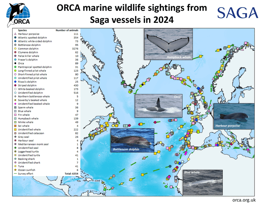Marine Mammal Surveyor teams spent a total of 243 nights at sea on Saga cruise ships, travelling to the Mediterranean, Caribbean, Africa, Norway, USA, Canada, Iceland, Canaries and Greenland. A total of 30,400 km of survey effort was conducted, with 1,077 sightings of 6,354 individual animals from 30 species. Much of this data was collected in data deficient offshore areas which highlights the conservation value of these cruises.