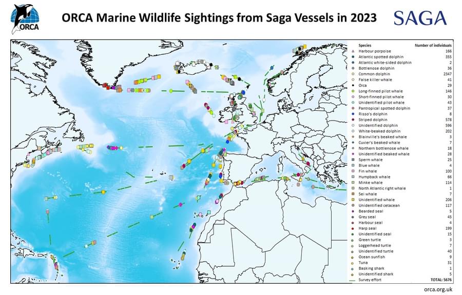In 2023 ORCA Marine Mammal Surveyors recorded over 5,000 animals from 32 different species onboard Saga cruises, with common dolphins being by far the most numerous species sighted.