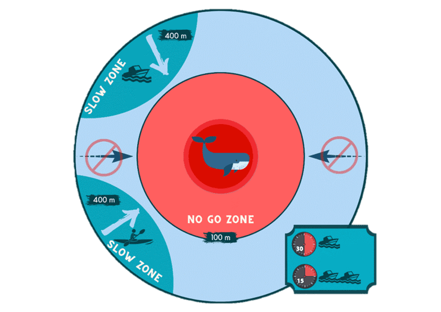 In order to mitigate the threats cetaceans face from irresponsible whale watching, it is imperative that boat operators and anyone with the interest of viewing whales, dolphins and porpoises in the wild, follow a strict code of conduct. Vessels have a ‘slow zone’ which is usually within 400m of the animals. If there are more than two boats within the vicinity, the third must wait behind the slow zone or caution zone before approaching. There is a ‘no go zone’ within 100m of the animals being observed. You should also not approach from in front or behind, but approach slowly alongside, within the respected distance. Absolutely no chasing of the animal is tolerated and your encounters should only last between 15 – 30 minutes. Any signs of distressed or aggravated behaviour displayed by the animals means you should create space by backing off immediately and safely.