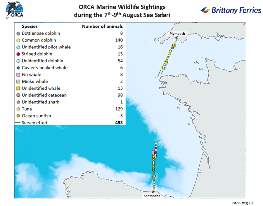 We departed Plymouth with a full ferry destined for Santander. The ORCA Sea Safari team; guides and guests, were treated to a very good presentation by Sina, our onboard Ocean Conservationist, all about ORCA and the species we might be lucky enough to spot.