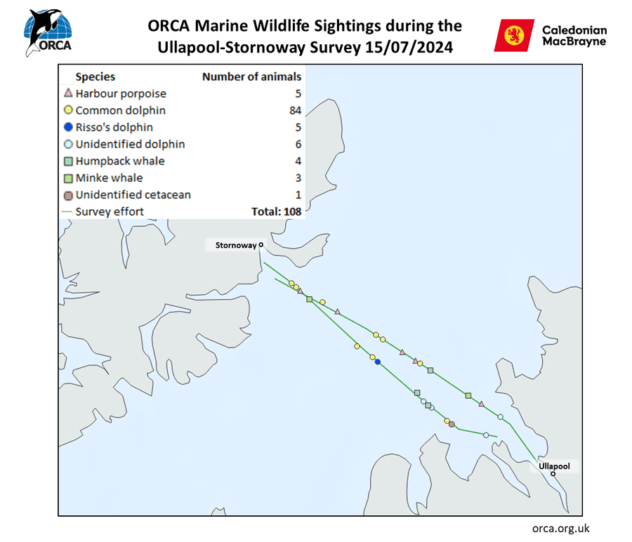 In July our team of Marine Mammal Surveyors on board Caledonian MacBrayne’s Loch Seaforth had an incredible survey sailing from Ullapool to Stornoway, with 108 animals recorded from five different species – including humpback whales on both the outward and return journey into Ullapool!