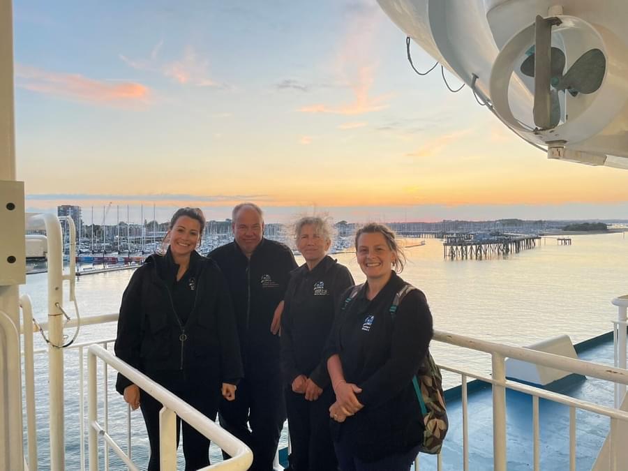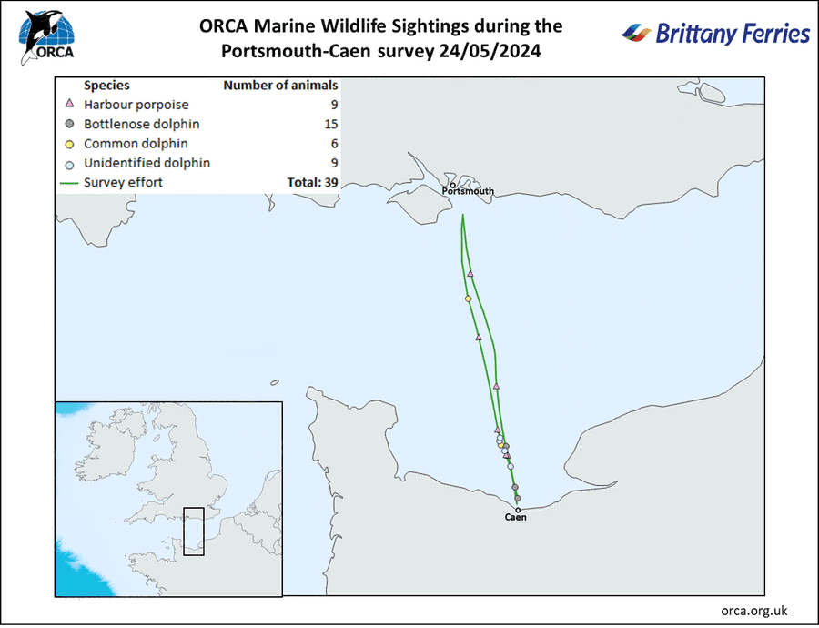 A week on from the Newhaven-Dieppe ferry survey of the 17th May, hopes were high among the team of four ORCA Marine Mammal Surveyors as they boarded the Brittany Ferries’ Mont St Michel bright and early on the 24th May to survey the English Channel. We knew that, generally speaking, the survey route from Portsmouth to Caen wasn’t known for producing a large number of sightings. Indeed, Julia, Neil and I had surveyed separately on this route before and had seen very little – in Julia’s case, nothing at all. Although we all know that no sightings on a survey is still really important data, telling us about the distribution and movements of whales and dolphins, we couldn’t help but hope we might be as lucky as the team on the Newhaven–Dieppe route exactly a week before, who recorded 17 sightings of 39 individual animals.