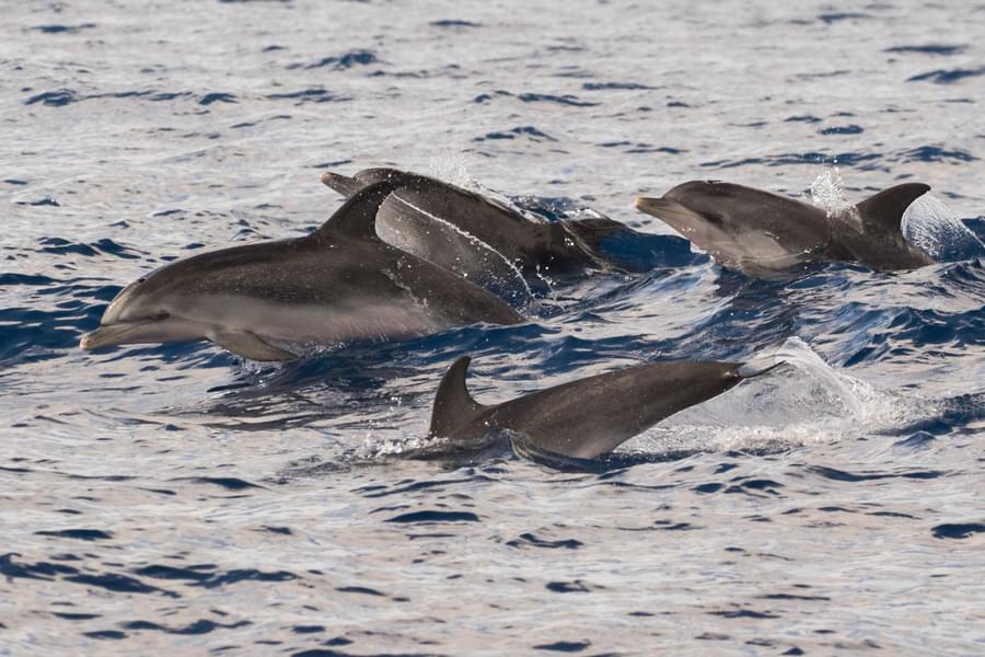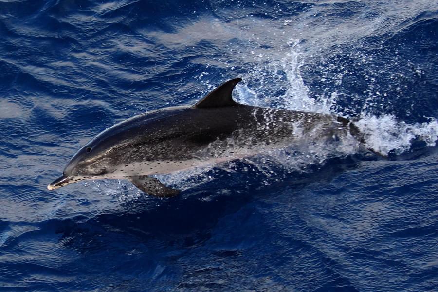 Atlantic spotted dolphins are fast acrobatic swimmers and are very active at the surface, often breaching, spinning, somersaulting, bowing and wake riding. They are typically attracted to ships to bow ride and can be observed in small and large numbers. They are often found in mixed groups with bottlenose dolphins. They form complex, sense social groups which can range in size from 5 - 100 individuals.