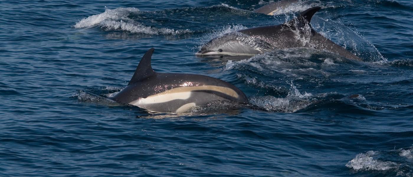 The Atlantic white-sided dolphin is a fast swimmer revealing only their upper back as they pass through the water. They are also known for their acrobatics, often exhibiting exuberant breaching and tail-slapping displays. They are sociable dolphins that like to hang out with large whales, riding in their bow waves. The are found in groups of 1-15 individuals, but huge aggregations occur in deep offshore waters.