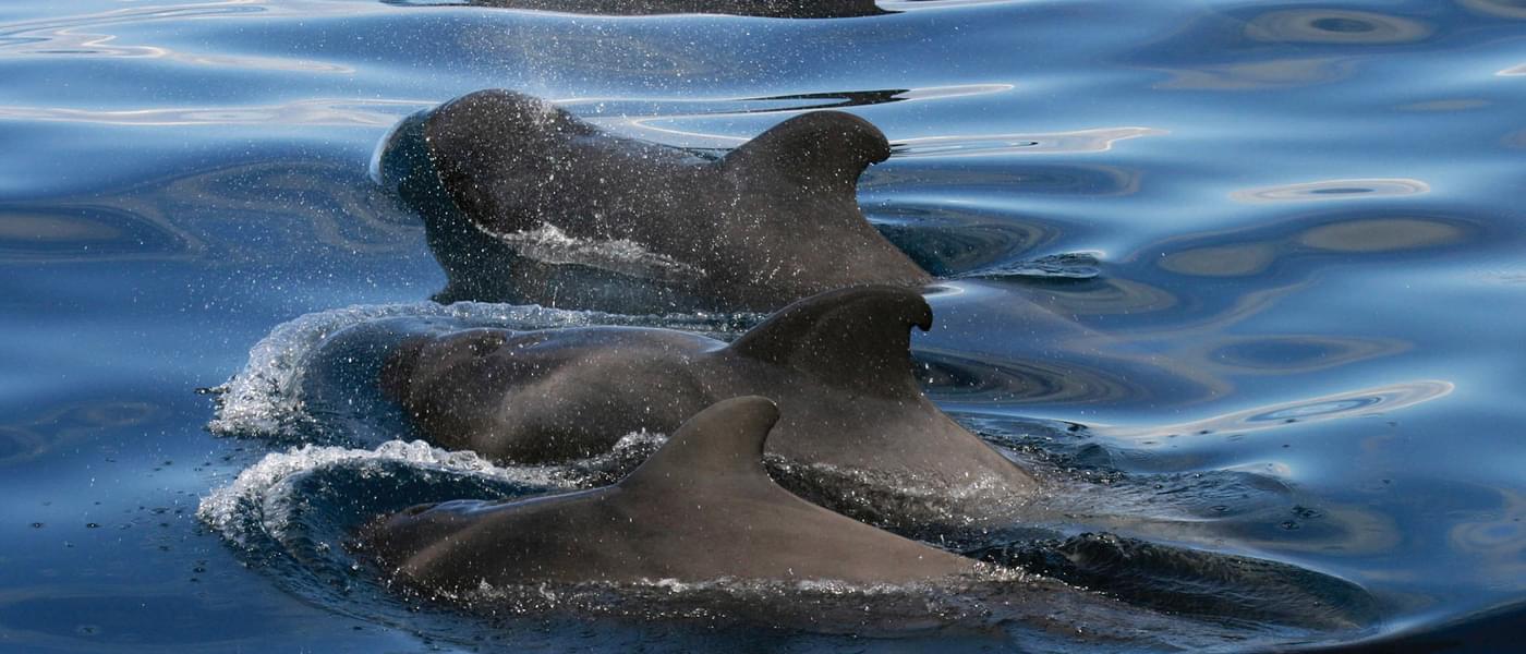 Pilot whales travel in family groups of 2 - 60 individuals, but larger groups are sighted in feeding grounds. They feed during the night, so their daytime behaviour is usually travelling leisurely and logging at the surface. They are playful and inquisitive, actively approaching ships and spy hopping, tail slapping and breaching. They associate with bottlenose dolphins, Risso’s dolphins and other cetaceans. When surfacing, the bulbous head and dorsal fin appear first. A slow roll of the back reveals the forward position of the dorsal fin, and the arched back shows a thick tailstock above the water.