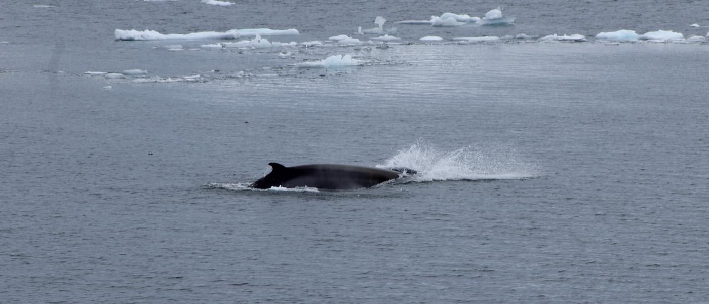 The Antarctic Minke whale has a very quick surfacing pattern. They surface just once or twice before a dive and the quick roll of their back makes them much harder to see than the larger rorqual whales. They are generally solitary but can be seen in small groups of two or three.