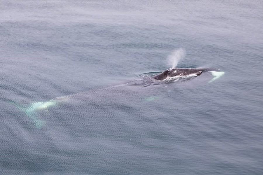 Bowhead whales feed at or below the surface of the water. They are slow swimmers but are known to breach, lob-tail, slap the water with their pectoral fins and spy-hop. When surfacing, the v-shaped blow with head and body appear first, they usually sink below the surface and occasionally will steeply arch their tailstock. Tail flukes are visible on a deep dive. Bowhead whales generally travel in groups of 1 - 6 individuals, but larger groups of up to 14 are occasionally sighted. They are rarely found far from the edge of the pack ice and are the only large whales to live exclusively in the Arctic.